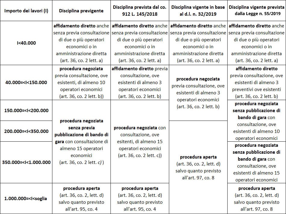 La seguente tabella (con quattro colonne riportanti nella prima la procedura prevista dal previgente Codice dei contratti, nella seconda la procedura con le modifiche introdotte dall’articolo 1, comma 12 della legge di bilancio 2019, nella terza la procedura scaturente dal testo dell’originario decreto-legge n. 32/2019 e nella quarta la procedura scaturente dal testo del decreto-legge n. 32/2019 con le modifiche introdotte dalla legge n. 55/2019) illustra le linee essenziali della nuova disciplina degli affidamenti di lavori “sottosoglia” consente di comprendere la portata normativa delle modifiche operate: